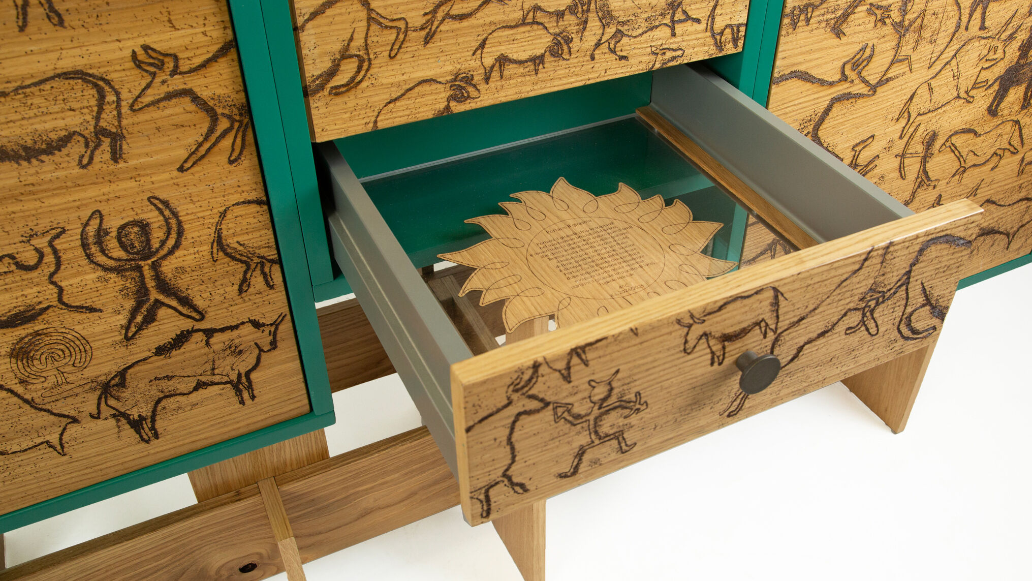 Al igual que el año pasado, también hemos colaborado con nuestra escuela asociada, el Istituto di Istruzione Superiore Statale di Sacile e Brugnera, para la SICAM de este año. Los estudiantes seleccionaron una pieza entre una gran variedad de proyectos y la presentamos a los visitantes en nuestro estand de la feria. Este mueble artístico tiene algunas características interesantes. Por ejemplo, se grabó un poema en un trozo de madera y se instaló entre dos paneles de plexiglás en el fondo del cajón. Otra característica especial es que el mueble se puede utilizar y abrir desde ambos lados. Uno de los lados del mueble es de diseño antiguo y el otro está adornado con cristal decorativo. Para dar vida a esta pieza, se instalaron nuestros sistemas de movimiento Nova Pro Scala y la bisagra de 110° Tiomos.